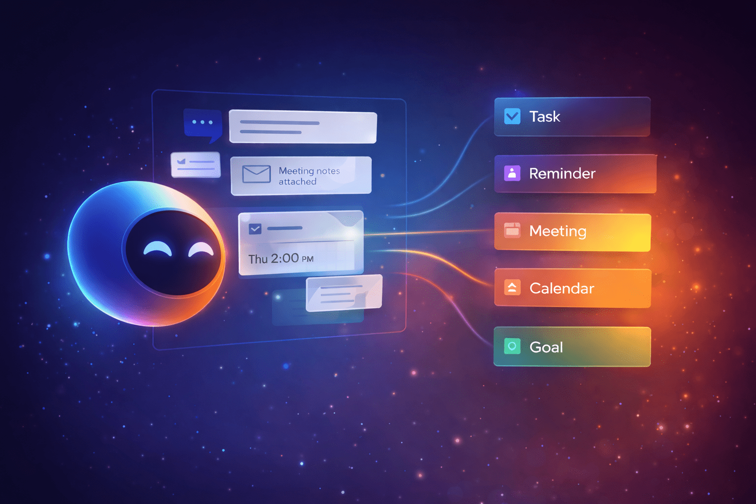 Tell me what’s on your mind: one sentence is enough. I’ll turn it into the right thing: a task, reminder, meeting, note, message/email, document, project, or goal. And if you connect your tools, I can capture things from there too: turn an email request into a task, pull a follow-up out of a chat thread, or save an attachment as a document. Always linked back to the source.