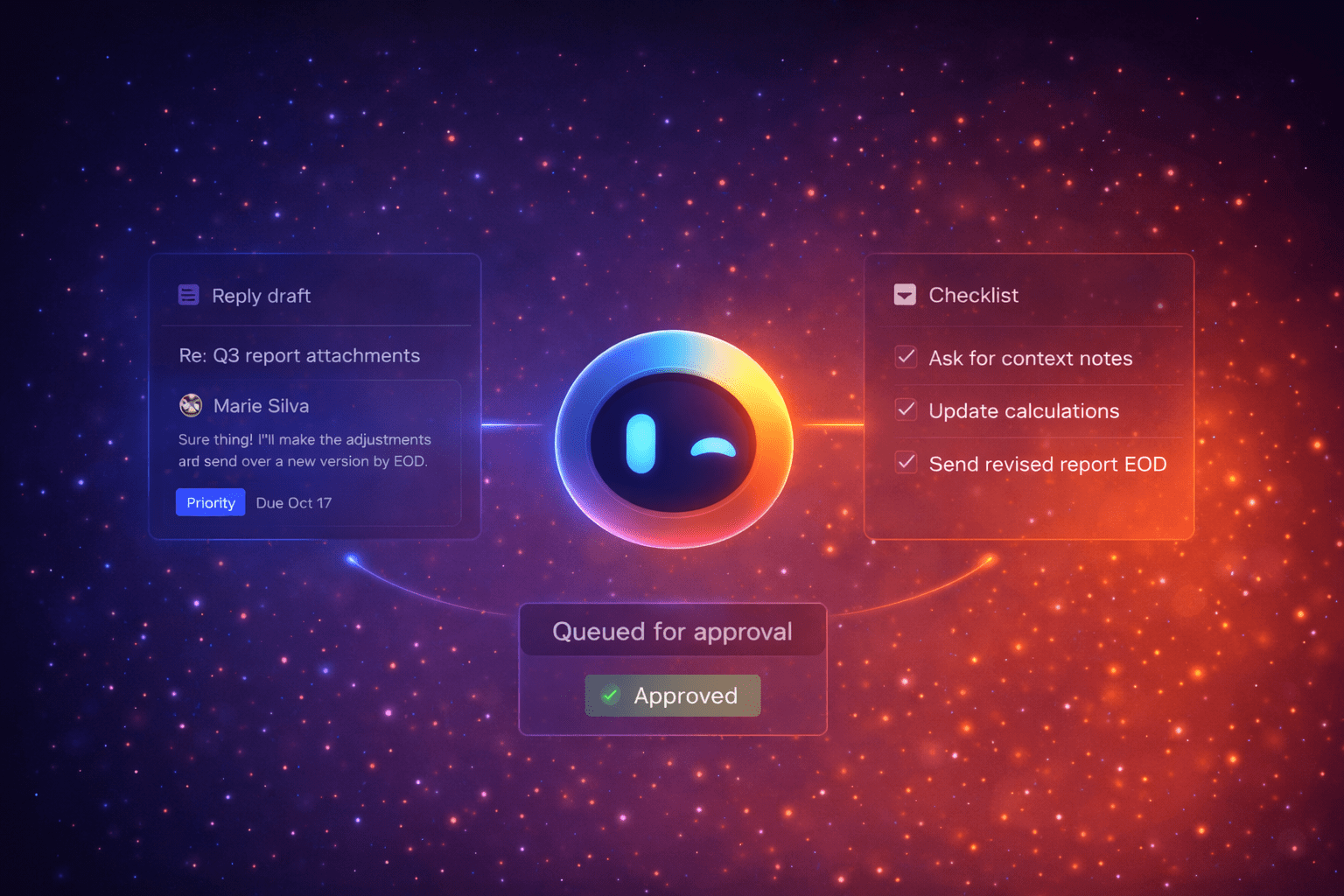 If you’re busy, you can hand things to me, like you would with a real assistant. I can screen what comes in, spot what needs a response, draft replies in your voice, and queue them for approval. You can also set simple rules for low-risk situations so I can handle them while you’re in focus.