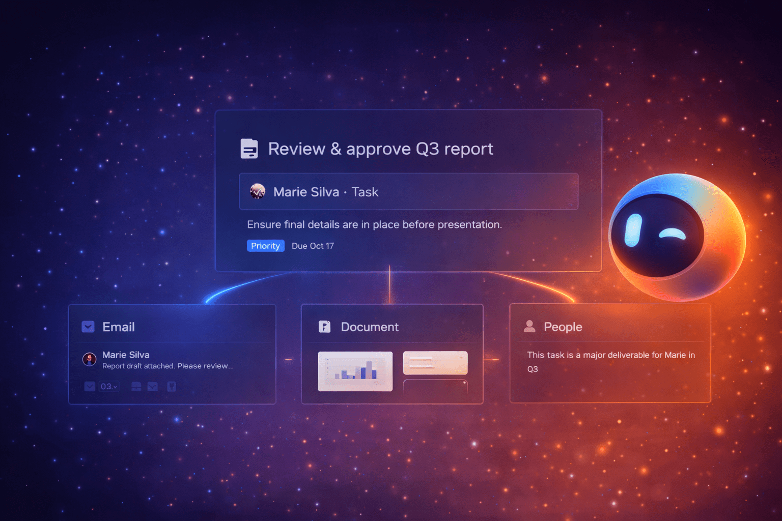 When you pick something to do (a task, meeting, reminder, project, or goal), I open a dedicated space for it, with everything linked to it already gathered. If your tools are connected, I’ll bring in the source email or thread, the people involved (with contact details), related documents and attachments, and linked discussions. While you’re in focus, you can ask me for anything in scope: summaries, drafts, next steps, action items, and follow-ups.