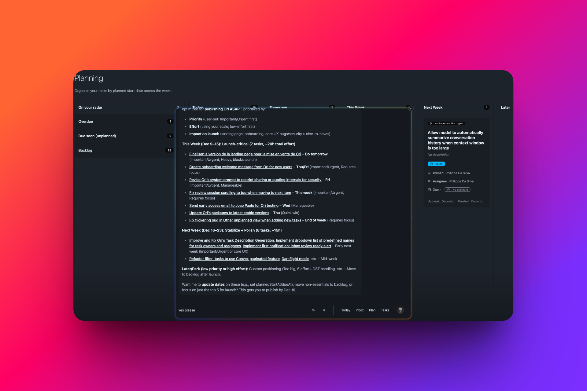 Ask Ori to clarify, rephrase, or break down tasks without leaving your flow.