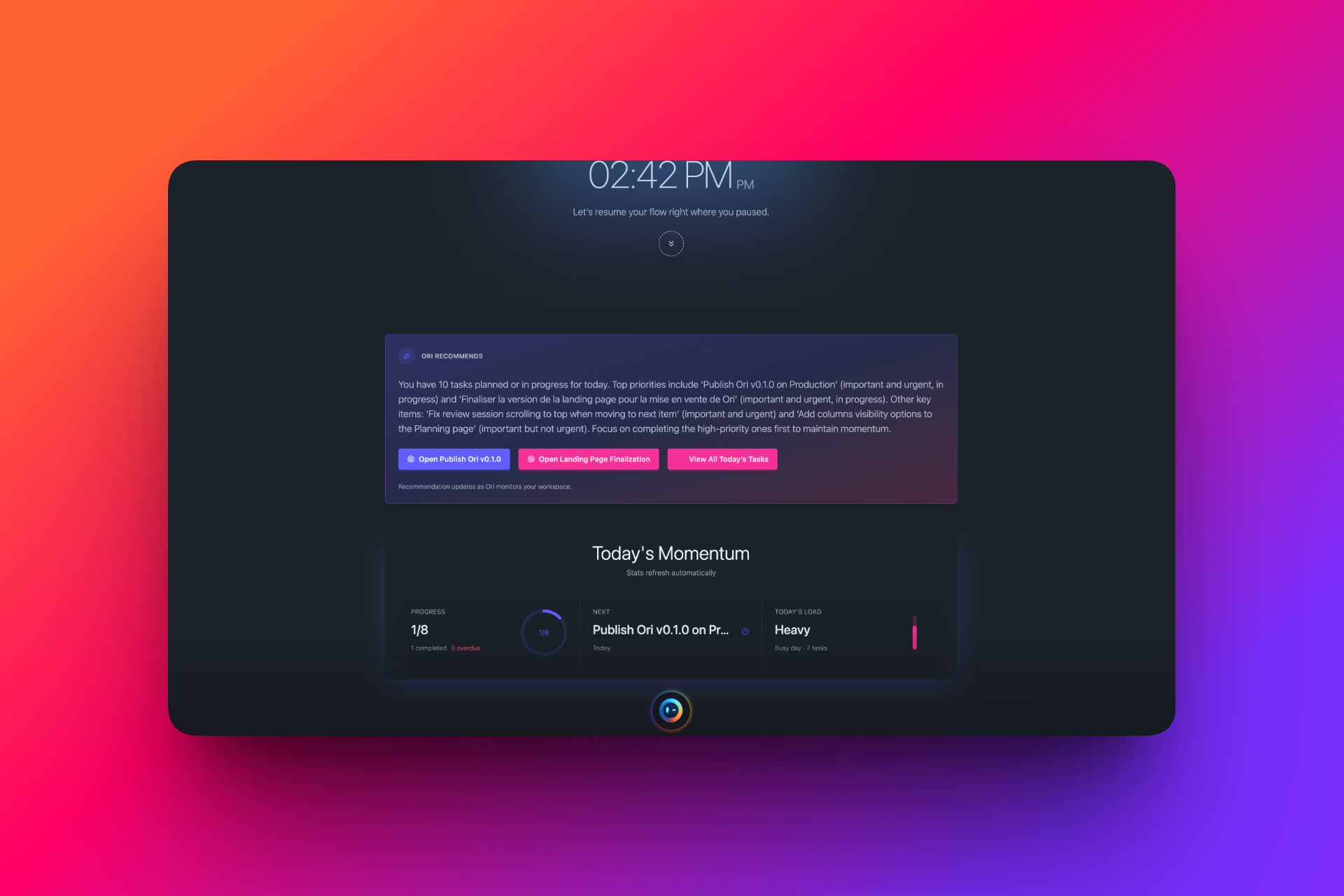 Capture, review, plan, focus, delegate: Ori helps you move through your day with clear next steps and less mental load.